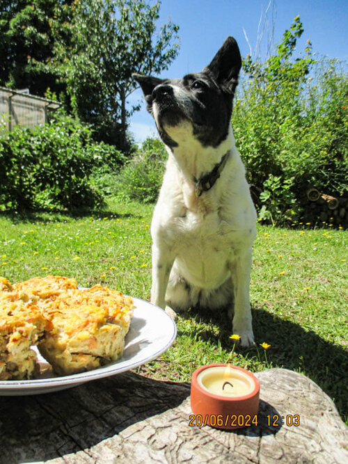 Nun ist Blümchen 12 Jahre alt geworden - und das ist für einen Hund ein gesegnetes Alter. Da darf man schonmal feiern! Natürlich mit Hundetorte und Kerze!