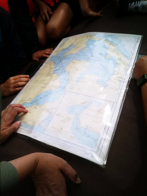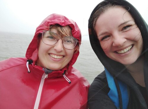 Unser Skipper Detlef schaute argwöhnisch zum Himmel, denn dunkle Wolken zogen auf. Den Kindern und Jugendlichen war es wichtig, dass sie baden gehen konnten. Und so warfen wir in der Nähe des Ufers den Anker. Juchzend sprangen die Abenteuerlustigen unter uns vom Boot ins Wasser. Leider musste aufgrund einsetzenden Regens das Baden beendet werden. Aus den wenigen Tropfen wurde bald ein ordentlicher Schauer. Bis auf zwei Betreuerinnen, die das Wetter unmittelbar miterleben wollten, gingen alle unter Deck. Die Farben wechselten in Grautöne. Die Sicht war schlecht, die Tropfen schlugen Blasen auf dem Wasser. Aber irgendwie waren trotzdem alle froh. Die, die nass wurden und diejenigen, die eingekuschelt in der Koje saßen und bei Süßigkeiten und Regenprasseln Gespräche führten.