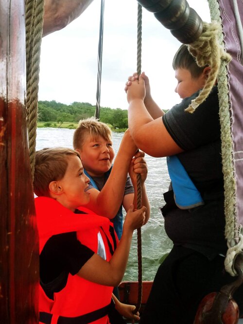 Am 24.07. waren Kinder/Jugendliche und Betreuer des Brandteichgrabens und der Tagesgruppe mit den „Twee Gebroeders“ unterwegs. Bei festem Boden unter den Füßen lernten die Kinder und Jugendlichen das kleine Seemanns ABC. Anschließend bestiegen wir den über hundert Jahre alten Frachtsegler mit seinem warmen glänzenden Holz und wunderschönen Segeln. An Bord war Handarbeit und Körpereinsatz gefragt. Während andere noch dabei waren, ihren Pulsschlag zu regulieren, halfen schon die ersten beim Hissen der Segel. Wir segelten durch das Achterwasser und richteten den Blick auf das glänzende Wasser und bauschige Wolken. Unter den Bewegungen des Wassers legte sich die Aufregung.