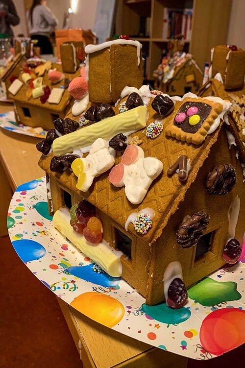 In einem anderen Raum stand für jedes Kind ein vorbereitetes Lebkuchenhaus zum Verzieren bereit. Mit kunterbuntem Naschwerk, Keksbuchstaben und Stiften konnte hier jeder nach Belieben kreativ werden. Am Ende stand auf dem Tisch ein buntes Dorf aus hübschen Häuschen.