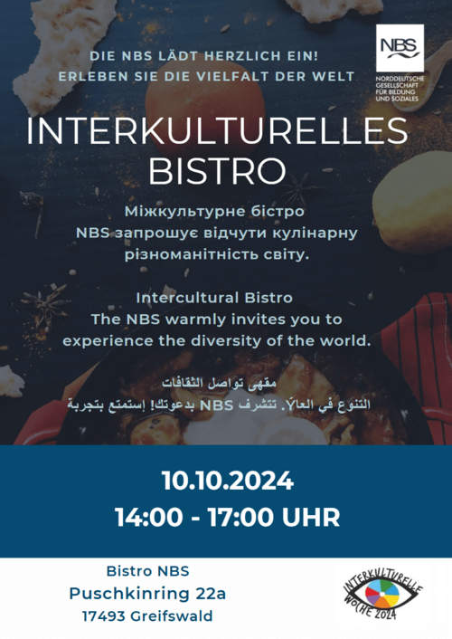 Im Rahmen der Greifswalder Interkulturellen Woche lädt die NBS am 10. Oktober 2024 von 14:00 Uhr bis 17:00 Uhr zu einem interkulturellen Bistro im Puschkinring 22a ein, das kulinarische Köstlichkeiten aus aller Welt bietet.