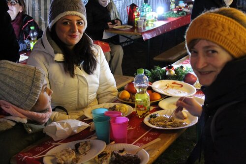 Mithilfe der betreuten Familien wurde ein reichhaltiges und internationales Buffet aufgebaut - was das Herz begehrt - von deutscher Bratwurst bis zu ukrainischen Blinis. Es gab Popcorn, Zuckerwatte und Kinderpunsch.
