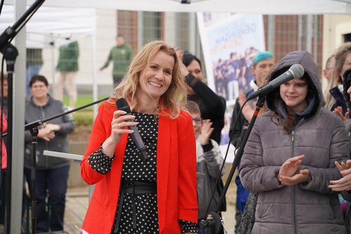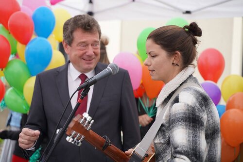 Und auch die Kinder und Jugendlichen, sowie Mitarbeiter*innen aus dem Fährhaus und dem Lotsenboot, hießen die neuen Nachbarn mit einstudierten Liedern, die musikalisch von Isabell Schmidt begleitet wurden, und bunten Luftballons herzlich willkommen.