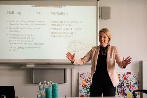 Zum Ende des Fachtages zeigte uns Sybille Marx als Greifswalder Coachin die verschiedenen Wege, um Kritik sowohl gut anzunehmen als auch gelingend zu vermitteln. Sie lud uns ein, in uns selbst zu horchen, worauf wir stolz sind, und wir sollten auch für uns die Messlatte selbst definieren, wie gut wir sind und dies nicht anderen zu überlassen. So gelingt es, besser Kritik anzunehmen.