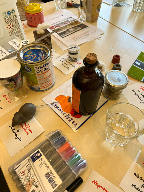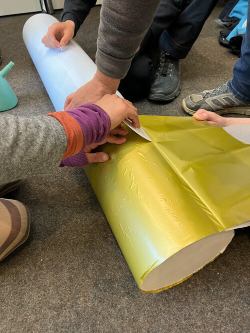 In einem gemeinsamen Treffen wurden dann zu den Inhaltsstoffen die einzelnen Wissenskärtchen beschrieben und die Zigarette beklebt, dass sie auch wie eine Zigarette aussieht. Eine Riesenzigarette - also gar nicht so einfach, es ohne viele Blasen und Falten hinzubekommen.