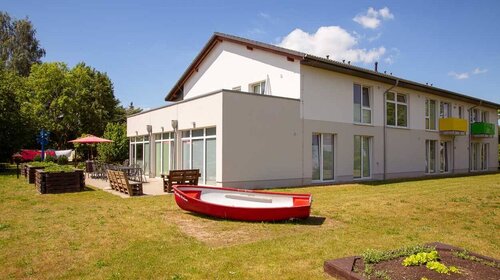 In dem großzügigen und hellen Gebäude inmitten eines naturnah gestalteten Freigeländes finden sich eine integrative Wohngruppe mit acht Plätzen und ein betreutes Wohnen mit vier Appartements.